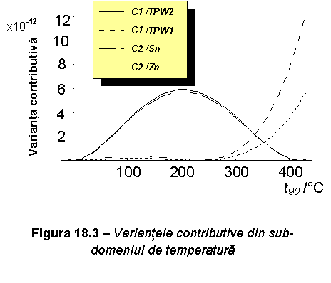 Pentru a ilustra utilizarea modelului la calculul incertitudinilor propagate la temperaturi intermediare am ales domeniul cuprins între 0 °C și 419,527 °C [4,5]. Punctele fixe de definiție specificate în SIT-90 pentru etalonarea TERP în acest domeniu sunt: punctul triplu al apei (0,01 °C) și punctele de solidificare ale staniului (231,928 °C) și zincului (419,527 °C). Setul mărimilor de intrare utilizate în această demonstrație a modului de aplicare a MAI este prezentat în Tabelul 18.2. Figura 18.1 prezintă cele mai mari varianțe contributive la varianța compusă uc2(WPF), evaluate la punctele fixe ale zincului și staniului. Dintre aceste varianțe contributive, cea simbolizată "I1I2", este asociată cu mărimile de intrare corelate I1 și I2. Incertitudinile de etalonare uc(WPF) evaluate pe baza modelului complet sunt egale cu 0,73 mK la punctul de solidificare al Sn și cu 0,99 mK la punctul de solidificare al Zn.