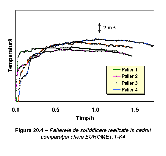 Măsurările s-au efectuat cu puntea automată de rezistențe ASL F18, interfațată și cuplată la calculator. În scopul determinării corecției efectului de auto-încălzire, măsurările s-au efectuat cu doi curenți de măsurare aflați în raport de 1 :√2. Valorile raportului Xt dintre rezistența TERP și rezistența rezistorului etalon au fost înregistrate, din 30 de secunde în 30 de secunde, pe toată durata palierelor de solididficare. Ca și în cazul măsurărilor de rezistențe, stabilitatea temperaturii rezistorului etalon este o condiție esențială pentru obținerea unei incertitudini reduse. Din păcate, laboratorul nostru nu are mijloacele necesare pentru controlul temperaturii rezistorului de referință. Rezistorul a fost meținut într-o baie cu ulei, mizându-se pe inerția termică mare a masei de lichid (≈ 80 l) și pe un control grosier al temperaturii camerei, realizat cu o instalație de climatizare. Valoarea rezistorului de referință a fost în permanență corectată în funcție de temperatură. ![]() Am calculat valoarea raportului Wt=Rt /RPTA, unde Rt este valoarea rezistenței TERP la punctul fix respectiv iar RPTA este valoarea rezistenței TERP măsurată la PTA, imediat după încheierea măsurărilor la punctul fix. Am calculat valoarea raportului Wt=Rt /RPTA, unde Rt este valoarea rezistenței TERP măsurată la punctul aluminiului iar RPTA este valoarea rezistenței TERP măsurată la PTA, imediat după încheierea măsurărilor la punctul fix. Conform Protocolului tehnic al comparației, am calculat valorile rezistențelor Rt și RPTA, valorile corecțiilor pentru efectul de auto-încălzire și efectul presiunii hidrostatice, precum și valorile raportului Wt și media acestora. De asemenea, am determinat și reprezentat grafic [16] influența fluxurilor de căldură parazite asupra temperaturii materializate. Pentru evaluarea incertitudinii de măsurare asociată raportului W(T90) la punctul de solidificare al aluminiului, am stabilit o metodologie de evaluare [16] pornind de la funcția de modelare specificată în Protocolul tehnic al Comparației [12]. (Pentru detalii, se va vedea Secțiunea 17.2.6.1, Metoda de evaluare dezvoltată). Astfel: ● am evaluat cele 19 componente ale incertitudinii; ● am calculat incertitudinea standard compusă; ● am calculat numărul efectiv de grade de libertate pe baza relației Welch-Satterthwaite; ● am determinat factorul de extindere și incertitudinea extinsă. În final, am întocmit un Raport [16] cu principalele rezultate ale măsurărilor INM pe care l-am transmis laboratorului pilot. Noua procedură de realizare a punctului de solidificare a aluminiului stabilită și implementată cu noile echipamente dezvoltate a dus la creșterea duratei palierelor de solidificare de la 15 minute la aproape două ore. De asemenea, pentru toate cele patru paliere de solidificare realizate în timpul măsurărilor din cadrul EUROMET.T-K4 (Figura 20.4): ● dispersia rezultatelor (exprimată prin abaterea standard experimentală a mediei): 0,6 mK; ● stabilitatea palierelor de solidificare: 1 mK timp de 70 de minute.